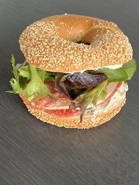 The Mary Newyorker: from the streets of Brooklyn Italian style. A freshly baked bagel with green olive cream cheese layered with premium salami slices, house made roast capsicum, provolone, tasty cheese & mixed greens.