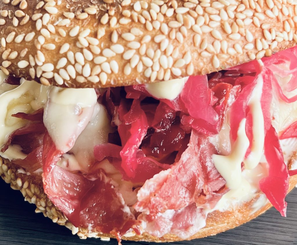 Bagelmama Pastrami Ruben: premium oven roasted pastrami with melted swiss cheese on a delicious lightly toasted bagel with sauerkraut, shreds of beetroot & our special bagelmama house ruben sauce., this bagel is heavenly