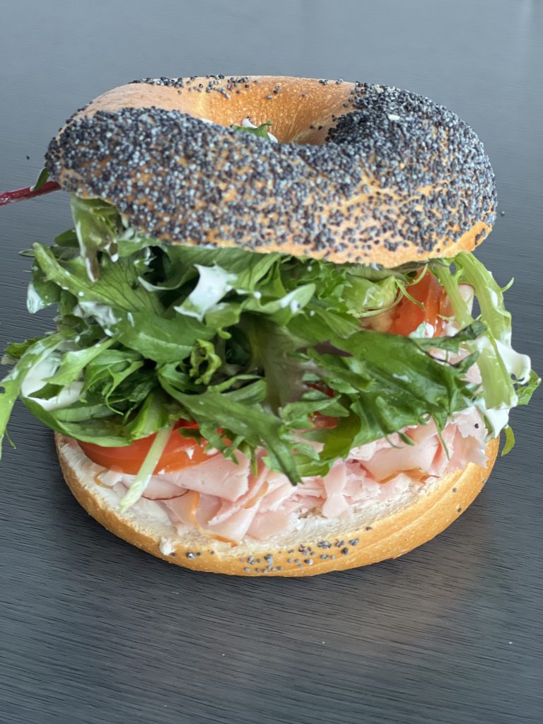 Turkey Delicious: turkey loaded bagel served with whipped cranberry cream cheese, cucumber, shaved onion, avocado, alfalfa sprouts & mixed greens